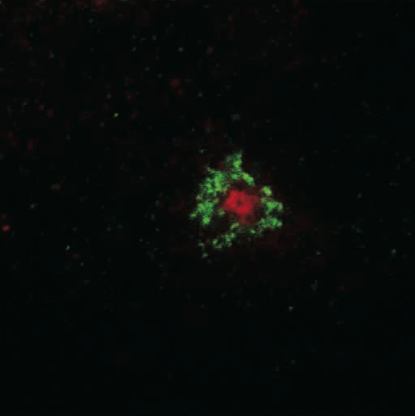 細胞外から蛍光標識したトランスフェリン(赤)を細胞に取り込ますことによってREを可視化。Golgi体(緑)に囲まれた稠密な領域に存在することが見てとれる。 |